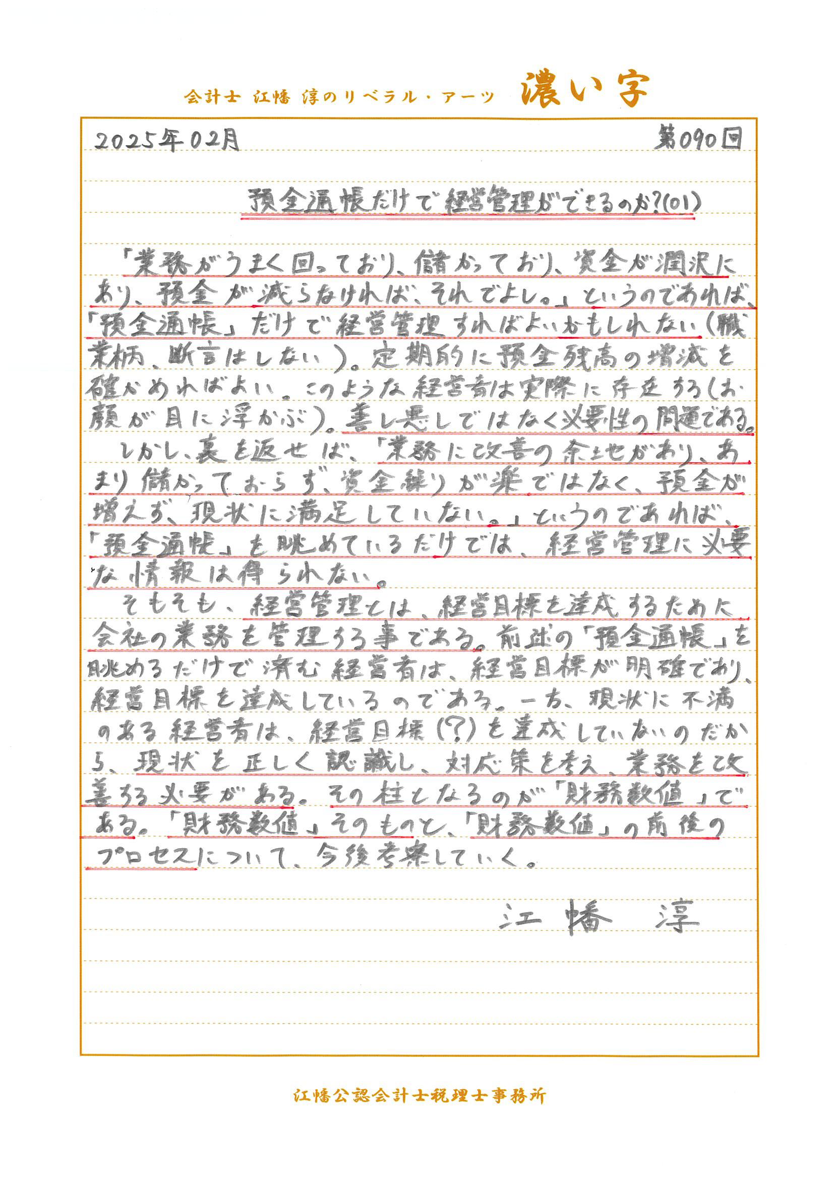 2025年02月号 第090回「預金通帳だけで経営管理ができるのか?(01)」 - 千代田区 番町 麹町 半蔵門 会計士 税理士 江幡公認会計士税理士事務所
